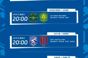 4月17日20:00,浙江俱樂(lè)部綠城vs北京國(guó)安