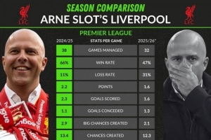 斯洛特兩賽季英超表現:勝率-19%、負率+20%,場均進球2.3→1.6