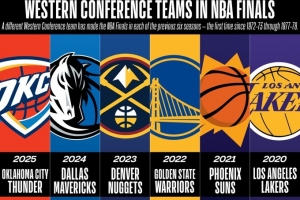 體育資訊4月17日訊 NBA官方今天分享了一個(gè)數(shù)據(jù):過(guò)去六個(gè)賽季,每年都有不同的西部球隊(duì)闖入NBA總決賽。這是1972-73賽季至1977-78賽季以來(lái)首次出現(xiàn)如此局面。