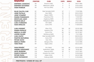 中場:莫德里奇(米蘭)、帕薩利奇(亞特蘭大)、弗拉西奇(都靈)、馬耶爾(沃爾夫斯堡)、盧卡·蘇西奇(皇家社會)、巴圖里納(科莫)、佩塔爾·蘇西奇(國米)、莫羅(博洛尼亞)、弗魯克(里耶卡)