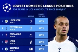 熱刺是聯賽排名第二低歐冠淘汰賽球隊,僅高于16-17賽季萊斯特城