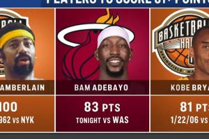 體育資訊03月11日訊 NBA常規賽,熱火150-129擊敗奇才。阿德巴約單場砍下83分,超越科比NBA歷史第2。