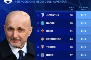 體育資訊3月11日訊 德國轉會市場統計了意甲各隊剩余10輪對手的平均排名,并列出榜單,尤文的對手平均排名最低。