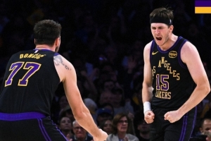 合砍62+18+19!湖人贏球海報:封面為東契奇和里夫斯怒吼瞬間