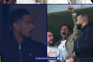 因傷缺席此役的貝林厄姆、姆巴佩在看臺觀看比賽,巴爾韋德進球之后,貝林厄姆表情驚愕,反應夸張,隨后鼓掌慶祝。