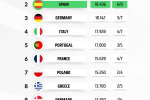 西班牙排名第二,只領先德國0.264分。