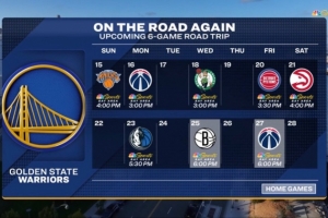 轉(zhuǎn)播方曬出本場過后勇士的賽程,他們將開啟六連客,對手分別為尼克斯、奇才、凱爾特人、活塞、老鷹和獨(dú)行俠。