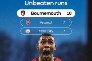 伯恩茅斯10場不敗是目前英超最長,曼城和阿森納都是7場