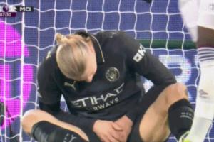 淡淡的憂傷!哈蘭德門前搶點(diǎn)不慎擊中襠部,隨后雙手捂襠痛苦跪地