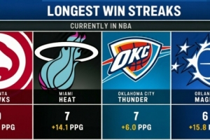 聯盟目前最長連勝數:老鷹9連勝 熱火&雷霆7連勝 魔術6連勝