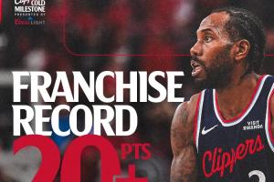 倫納德單賽季連續(xù)45場比賽得分20+,超越鮑勃·麥卡杜獨占快船隊史第一。